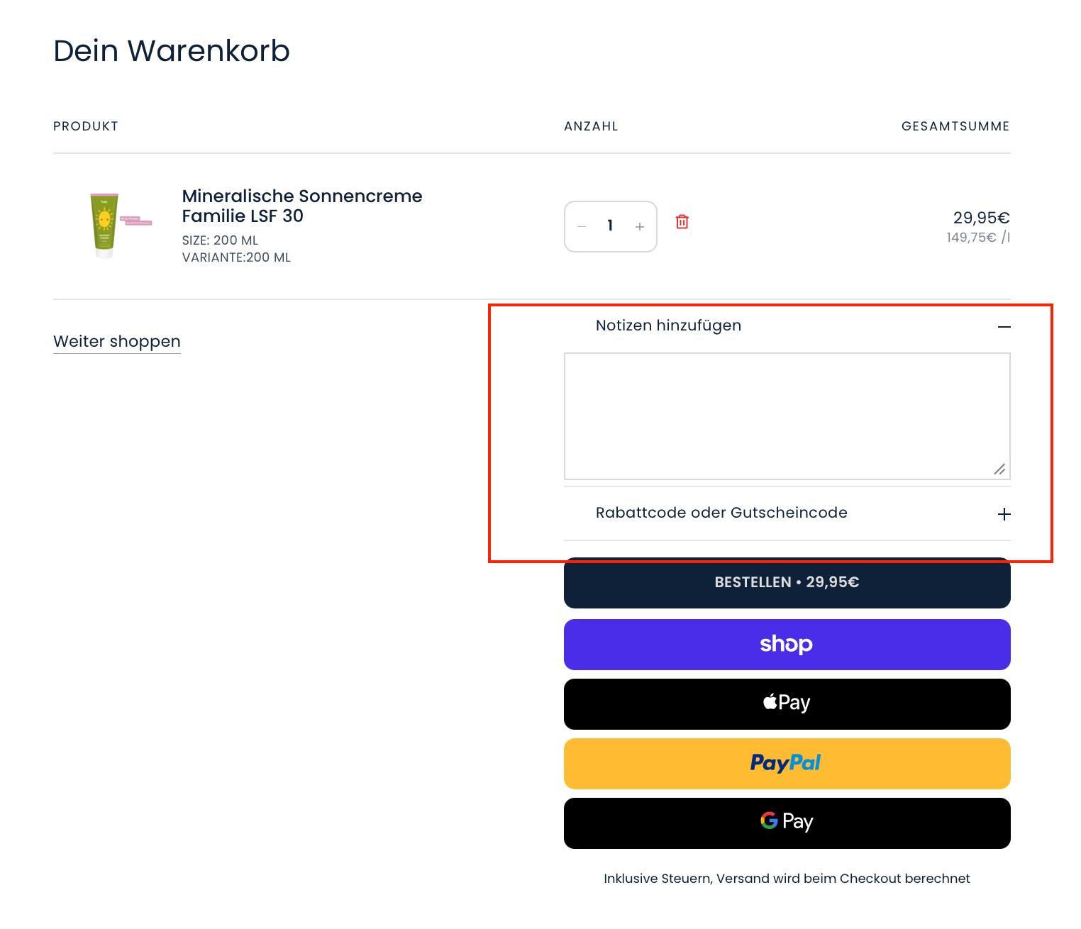 Unterhalb der Produkte findest du die Möglichkeit ein Feld zu öffnen und Deine Notiz zu hinterlegen.